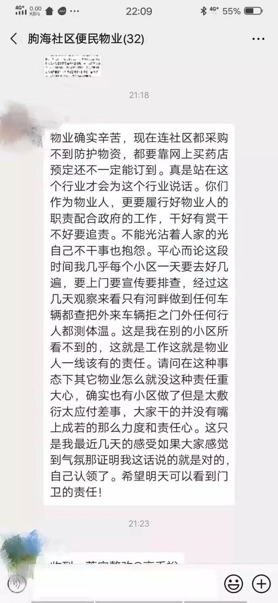 No.1定时定点 消杀防控 对业主高频接触的重点部位增加消杀频次,做到消杀工作定时、定点、有记录。对小区的地面、单元楼道、电梯间、污水井盖、地下车库等所有地方全部喷洒消毒水,每日不少于2次的定时消毒。 No.2小区居民 严防严控 在小区门口设置监测点,每位进入小区的居民都要进行体温测量,体温正常后才能进入小区,小区的另一个进门被关闭,只留一个大门供居民出入。 No.3防疫标语 宣传到位 小区的醒目位置张贴着宣传海报,电子屏滚动播放防疫注意事项,营造社会宣传氛围,不断增加居民防护意识。 No.4联合社区 响应政府号召 积极配合社区工作,响应政府号召,密切关注武汉返呼人员,对于社区下发的预防资料,及时向业主普及,时刻关注业主舆论情况,不信谣、不传谣,在日常接触过程或业主微信群内,出现冠状病毒肺炎动态的虚假言论时,即时进行制止和积极引导,避免引发恐慌。应对新冠性肺炎疫情,重在社区防排查与管控,积极做好各项防控措施,竭尽全力保护河畔花城业户的健康安全。在社区检查中受到社区领导表扬。 No.5防御工作 从自身做起 对坚守在一线的河畔花城工作人员,每日定时询问、测量体温,发现异常按相关程序及时上报、隔离,同时指导员工做好防护,佩带口罩上岗作业,这是对园区所有业主负责。 物业,一个在和平期间,几乎遭全网诟病的行业!然而正是这群人,用血肉之躯,在新型冠状病毒爆发之初的无序时期 ,为居民筑起了第一道防线!商店可以关门,餐厅可以停业,公共交通可以停运,物业,却是24小时不眠不休!他们没有专业的防护装备,没有专业的专家指导,可物业的防控动作,却一招一式快速有力!请不要指责物业人没有做更多!他们的表现,无愧于自己的职责。请善待你身边的物业人!他们从未抱怨,但他们需要理解和尊重!