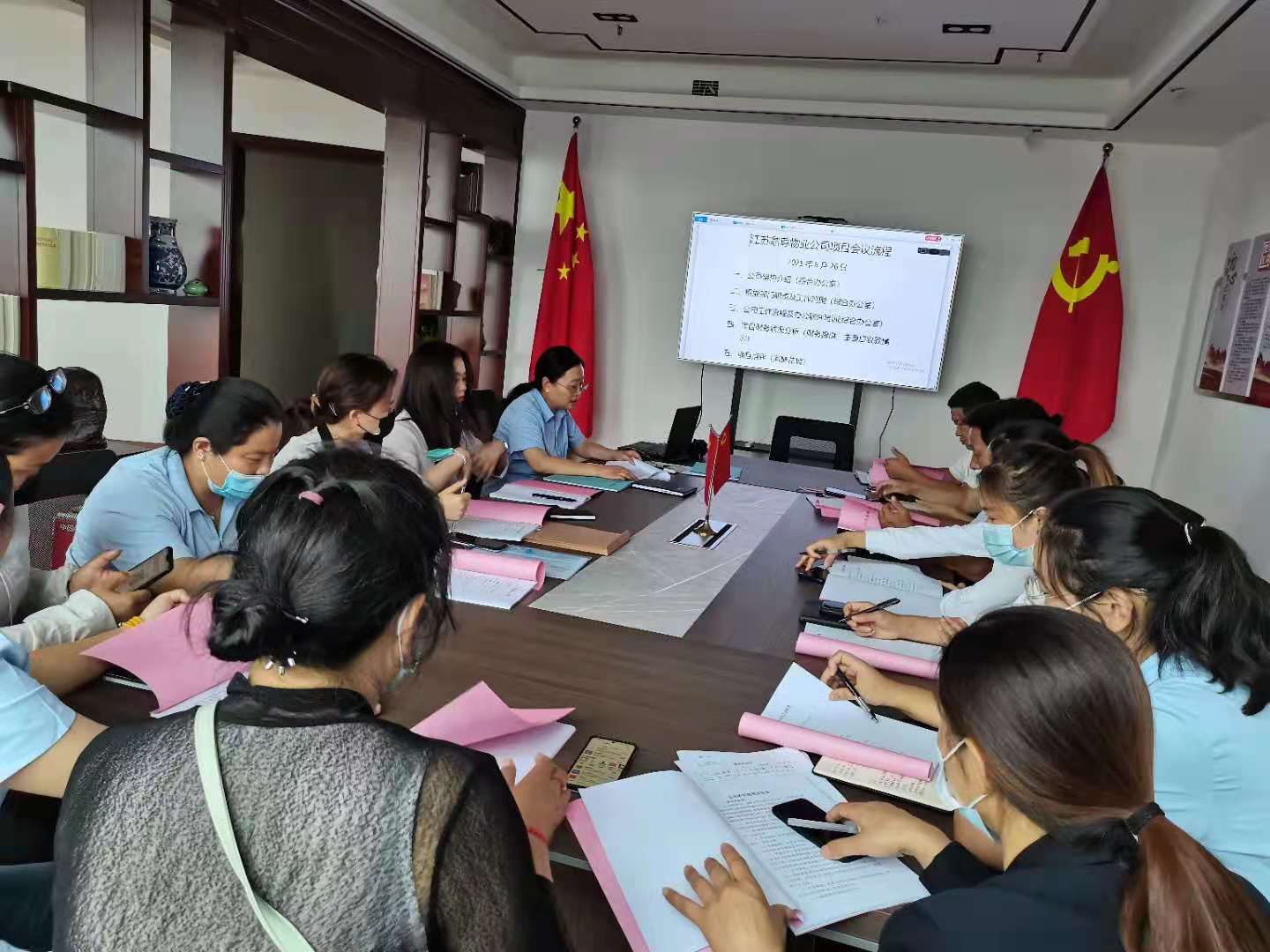 本次培训主要分为两个部分,一是由综合办公室主任金莉就公司职能部门职责、公司工作流程及办公软件的使用进行了培训,其中着重对仓库物品的出入库领用在企业微信里审批流程进行了深入讲解;二是由人力资源部经理曹娟关于项目上招聘员工在企业微信里的审批流程、入离职合同申请的完善进行了讲解,并组织大家认真的学习了公司《员工手册》。