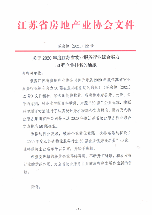 11月15日,江苏省房地产业协会公布了2020年度江苏省物业服务行业综合实力50强企业名单,鼎尊物业凭借综合实力和管理水平,荣获“2020年度江苏省物业服务行业综合实力50强企业”称号。