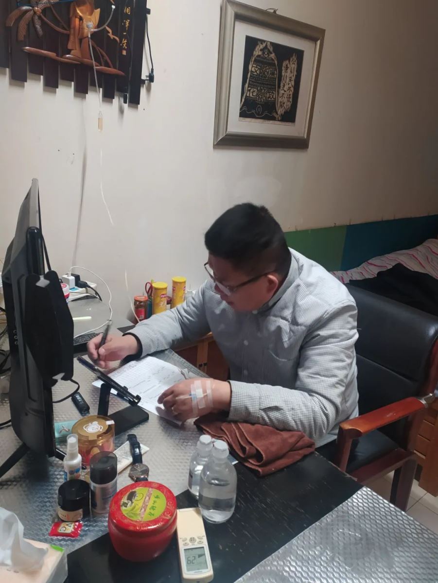 他左手挂着液体打点滴,右手翻着文件,仔细查看各项工作内容。由于感冒发烧忍着疼痛一直坚守在岗位上,他就是江苏鼎尊副总经理王同洋。