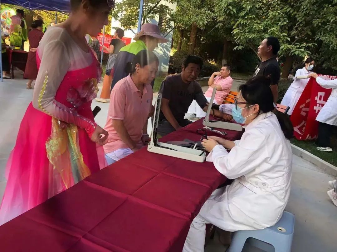 义诊现场,医务人员摆起义诊台,为每位老人量血压、测血糖、测心率等等,针对老人们关于常见病的预防治疗问题,医务人员耐心细致地为其讲解注意事项。