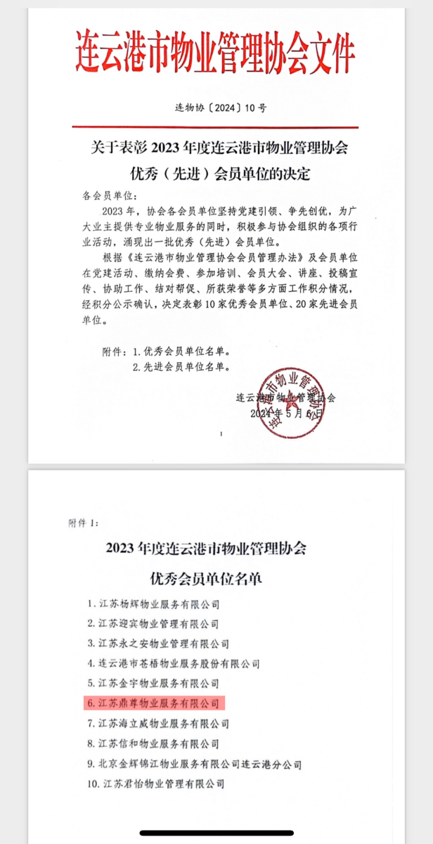 2024年5月15日,连云港市物业管理协会第八次会员大会表彰会上,江苏鼎尊物业荣获2023年“优秀会员单位”荣誉称号。