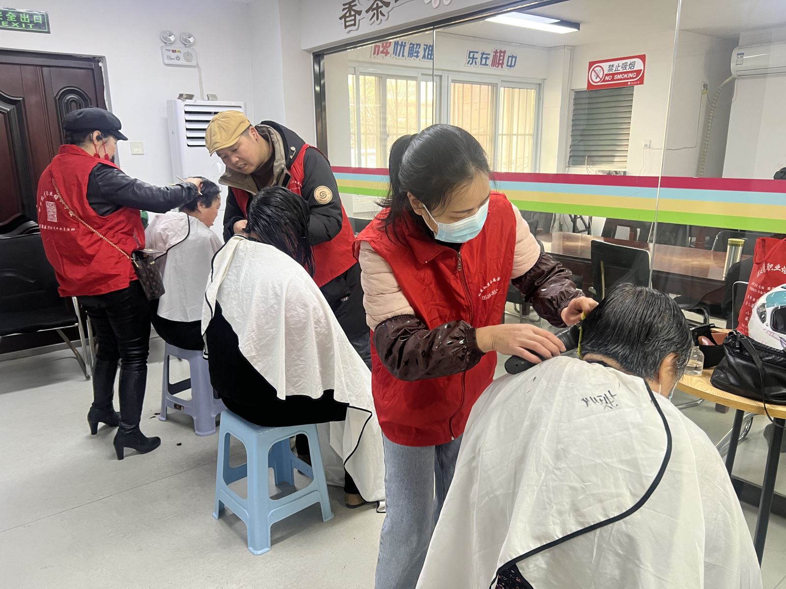 义剪区域,理发师们早早准备好工具,为老人们提供贴心服务。他们手法娴熟,根据大家需求精心修剪发型。大家看着修剪后的清爽发型,脸上洋溢着满意笑容。