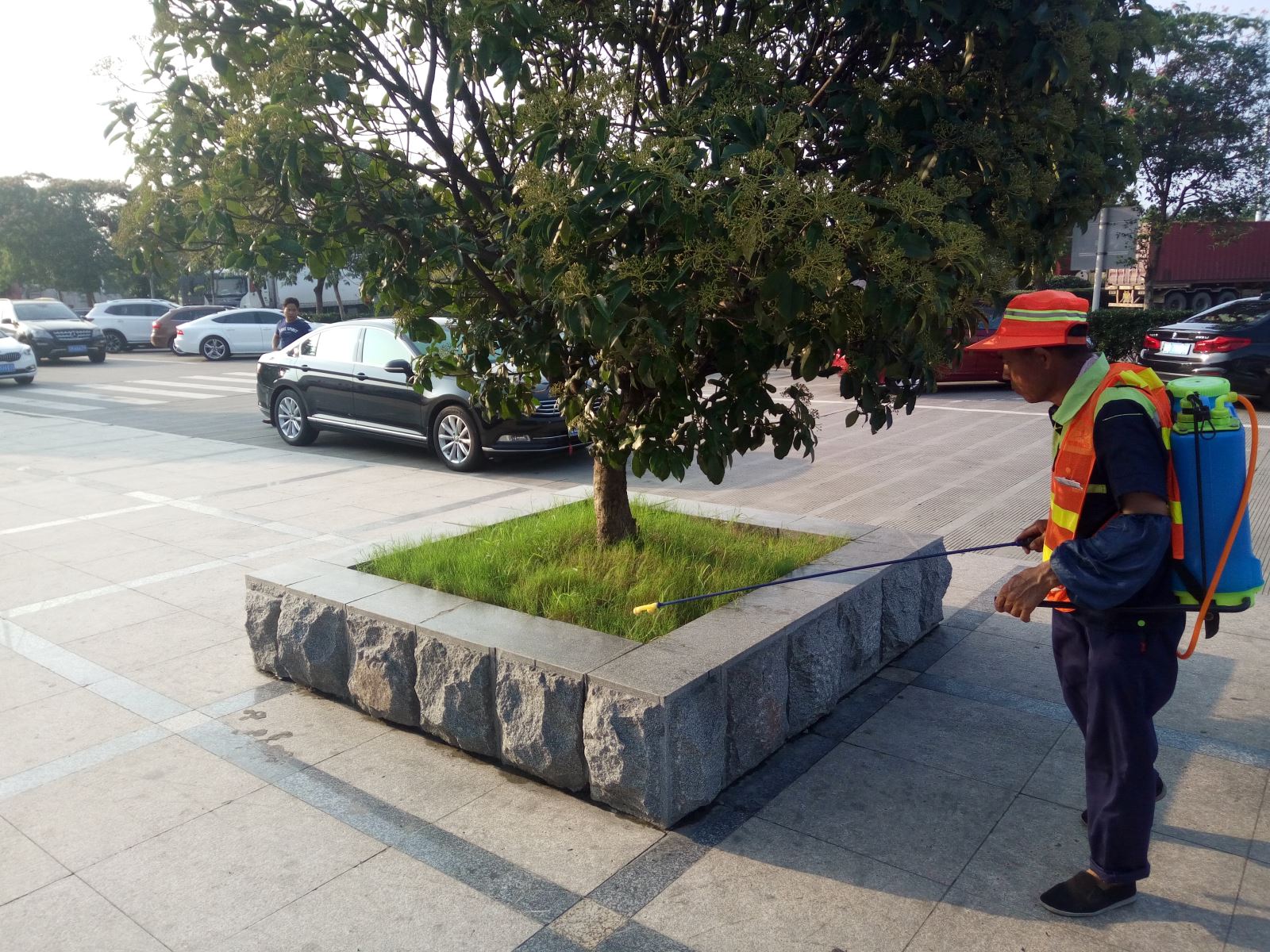 保洁师傅为绿植进行环境消杀工作,为服务区创造 舒适的环境——浦南服务区