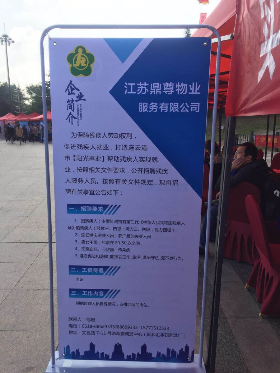 为了保障残疾人劳动权利,促进残疾人实现就业,打造连云港市《阳光事业》帮助残疾人实现就业,按照相关文件要求,公开招聘残疾人服务人员。5.19日江苏鼎尊物业参加连云港市第二十九次全国助残日 广场活动