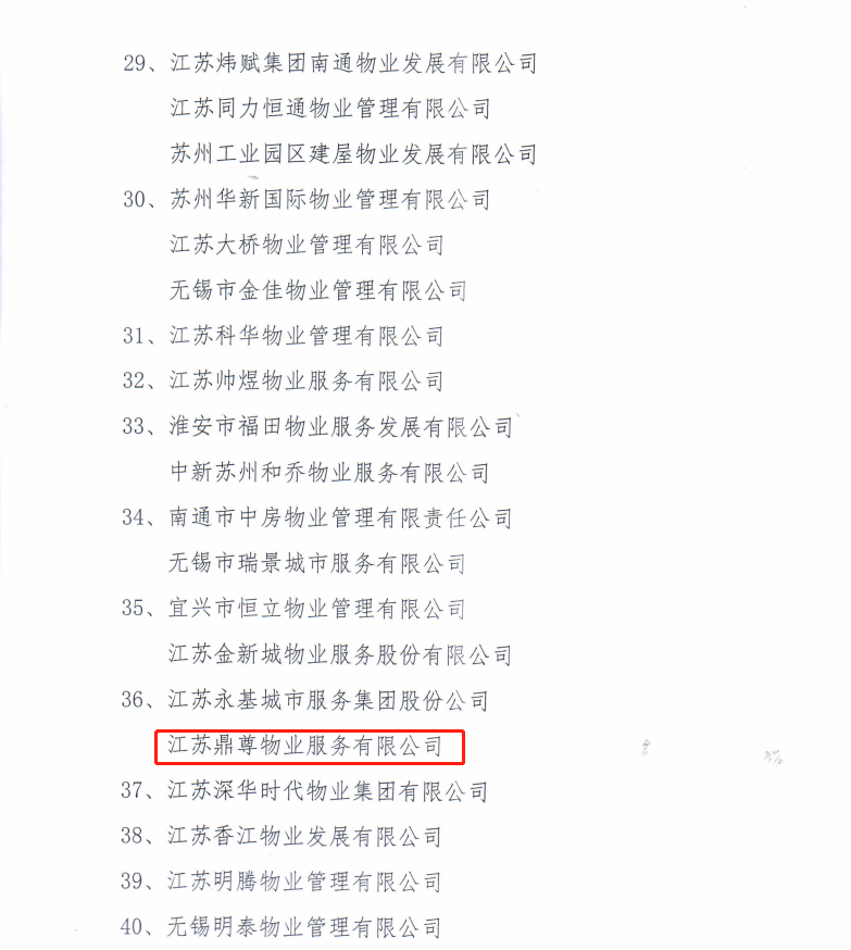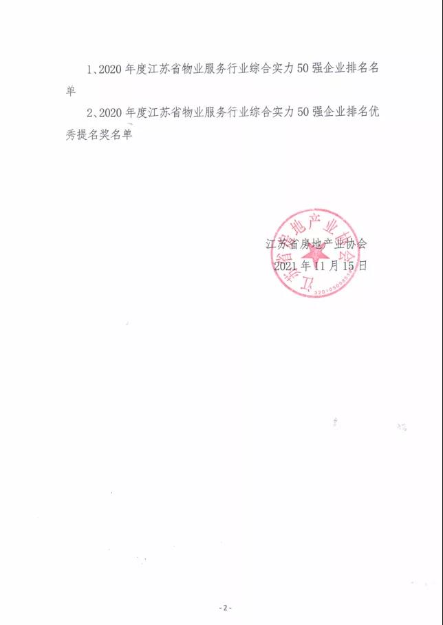 11月15日,江苏省房地产业协会公布了2020年度江苏省物业服务行业综合实力50强企业名单,鼎尊物业凭借综合实力和管理水平,荣获“2020年度江苏省物业服务行业综合实力50强企业”称号。