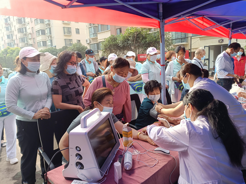 为排队的居民依次进行检查,义诊项目多种多样,服务齐全,有血压、血糖、骨密度、口腔健康及健康知识宣传等,志愿者们耐心、详细地解答居民的咨询,项目处