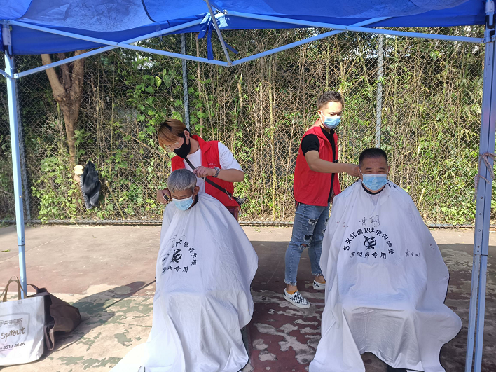 剪出关爱。一把椅子,一块布,几件必备的工具,理发志愿者充分发挥自己的技艺,利用手中飞舞的剪刀,为居民们理发。没有花哨的造型,却