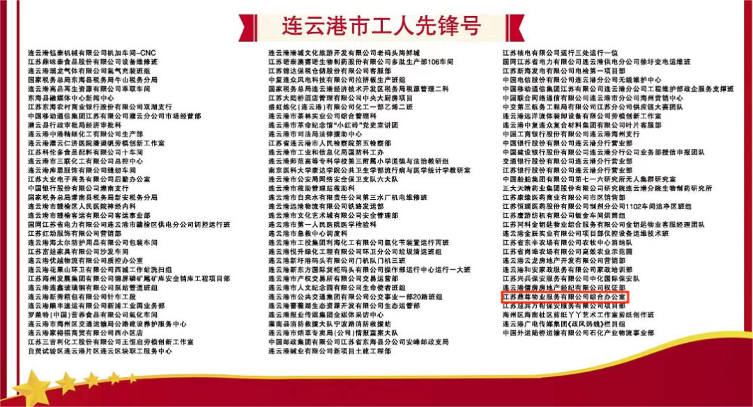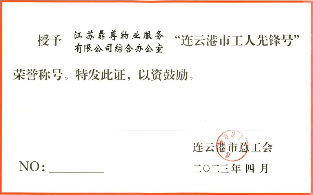 五一前夕,连云港市总工会公布关于表彰2023年连云港市五一劳动奖和工人先锋号的决定,江苏鼎尊物业服务有限公司综合办公室被授予“连云港市工人先锋号”称号。