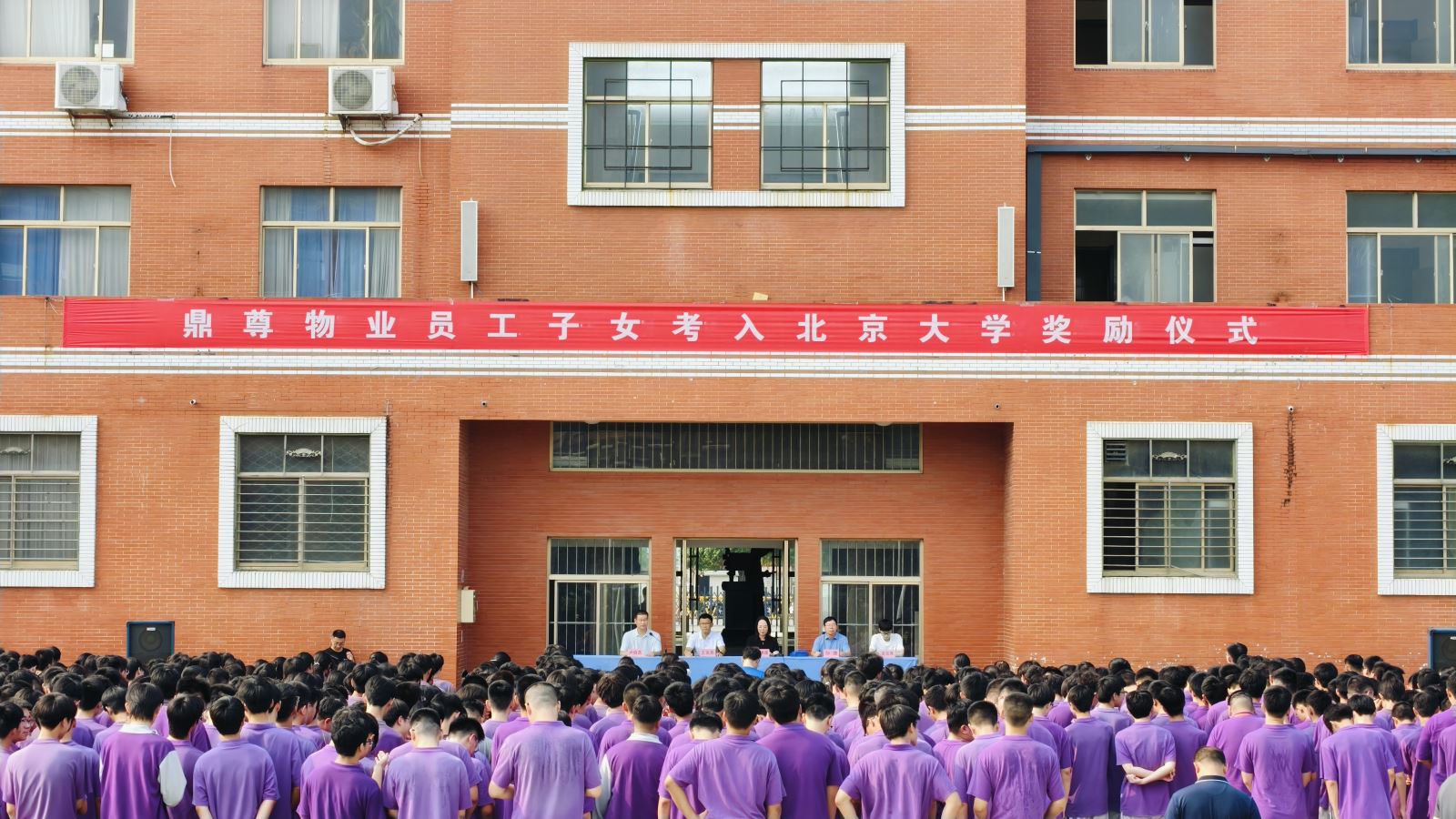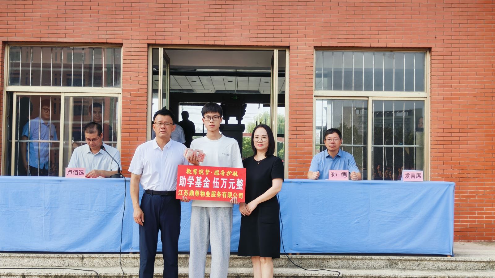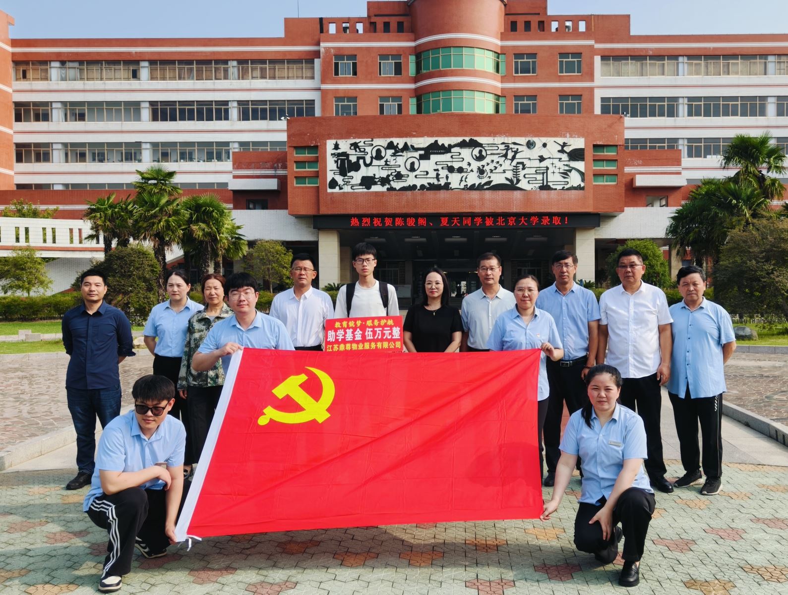 2025年8月5日上午8时,江苏鼎尊物业项目处洋溢着热烈而庄重的气氛。为表彰东海教育局员工子女夏天同学以优异成绩考入北京大学,鼎尊物业董事长王俪儒携公司相关领导在此举行隆重的奖励仪式,现场向夏天同学颁发伍万元奖学金。东海教育局相关领导、东高教干、部分教师代表及新高三学生共同见证了这一时刻。