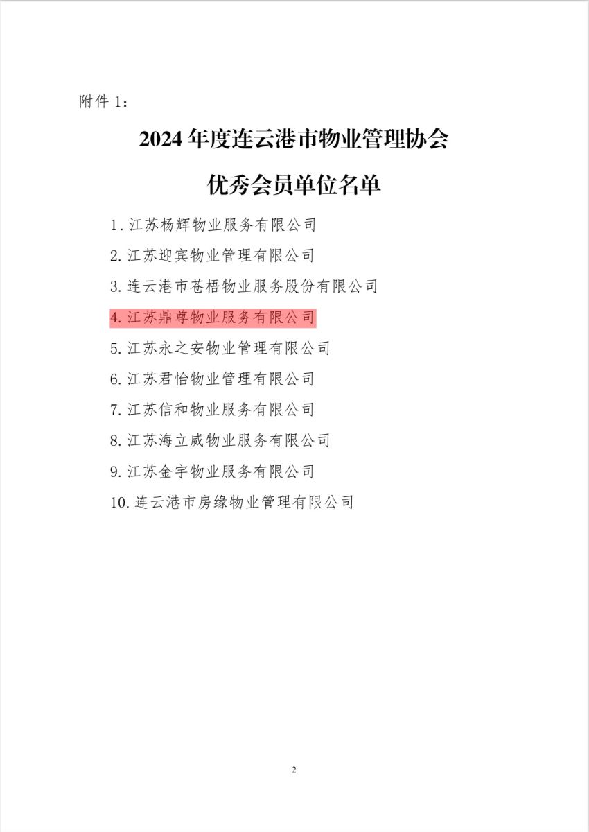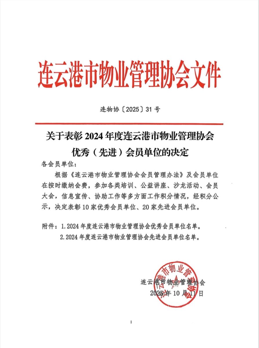 2025年10月11日,连云港市物业管理协会第九次会员大会表彰会上,江苏鼎尊物业荣获2024年“优秀会员单位”荣誉称号。